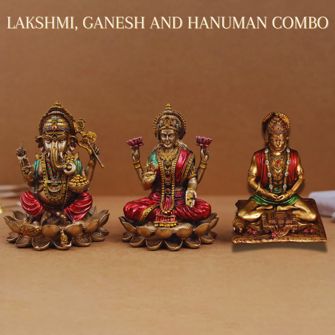 Invite the divine trinity of prosperity, wisdom, and strength into your home with this sacred Antique Finish Ganesh, Lakshmi & Hanuman Ji Combo (4 Inch).