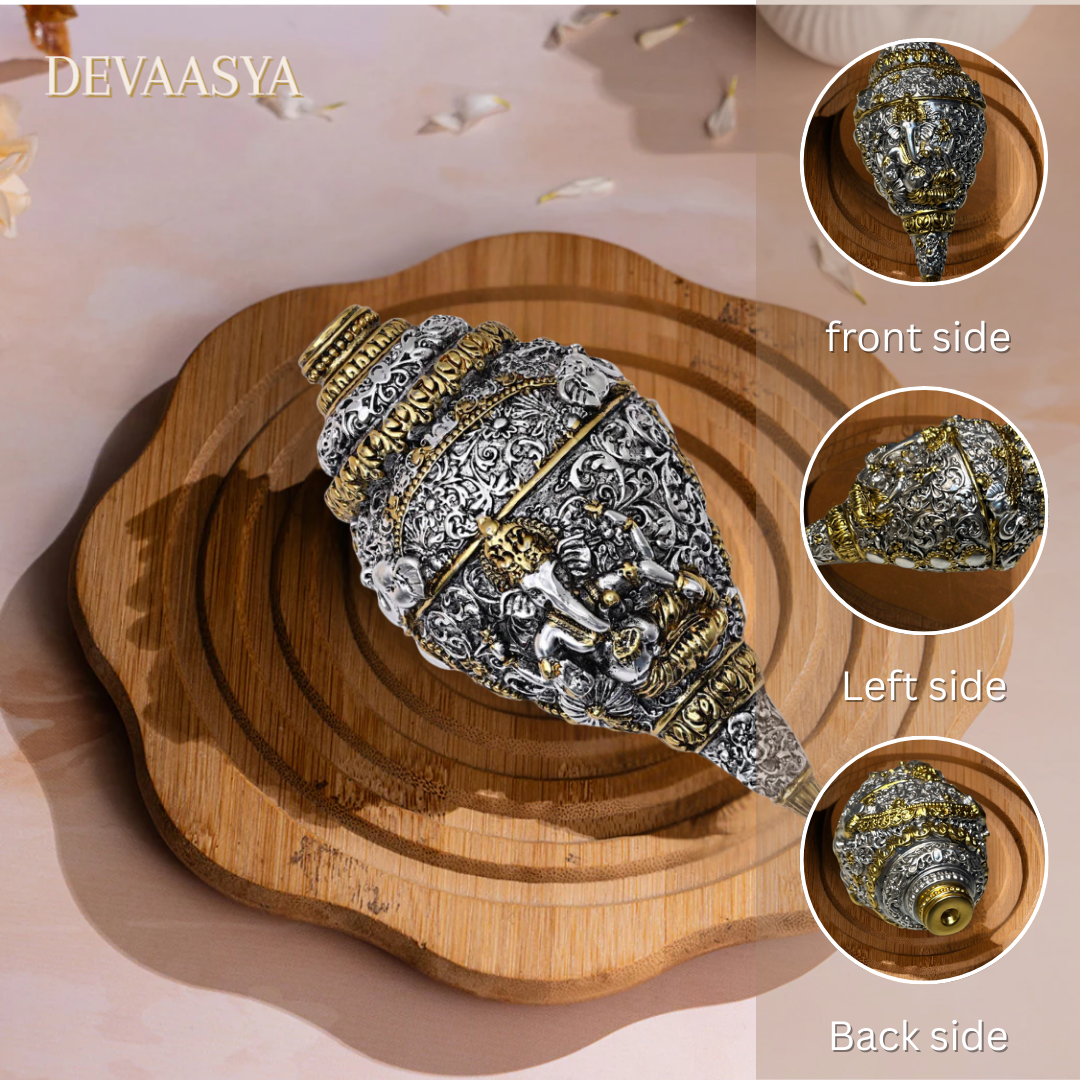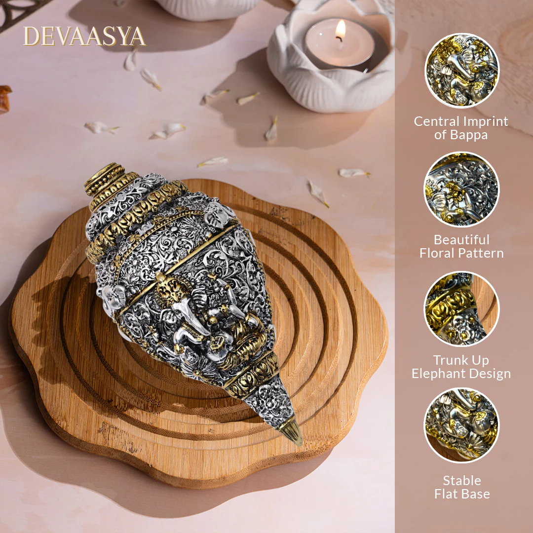 Bring divine energy and prosperity into your space with the Ganesh Shankh (Conch) from Devaasya, beautifully crafted and finished in 24K gold and silver plating. This sacred idol symbolizes the blessing of Lord Ganesha emerging from the holy shankh (conch), making it ideal for daily pooja rituals, home temples, car dashboards, office desks, or as a thoughtful gift for festive and spiritual occasions.
