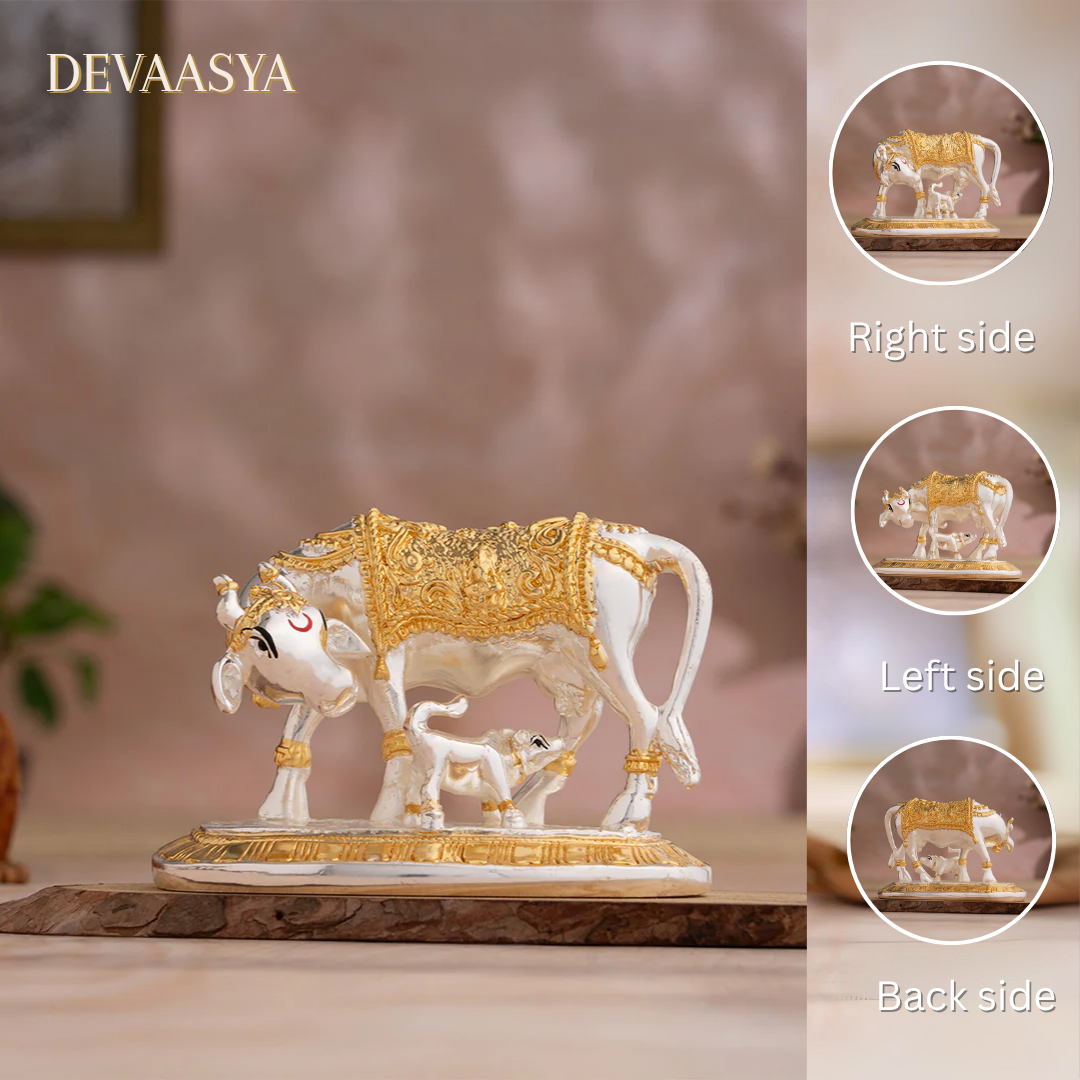 This intricately crafted idol features Kamdhenu along with her calf, radiating a powerful spiritual aura. The elegant blend of gold and silver plating brings a premium finish to this sacred idol, making it an ideal piece for puja rooms, vastu corrections, gifting, and festive décor.