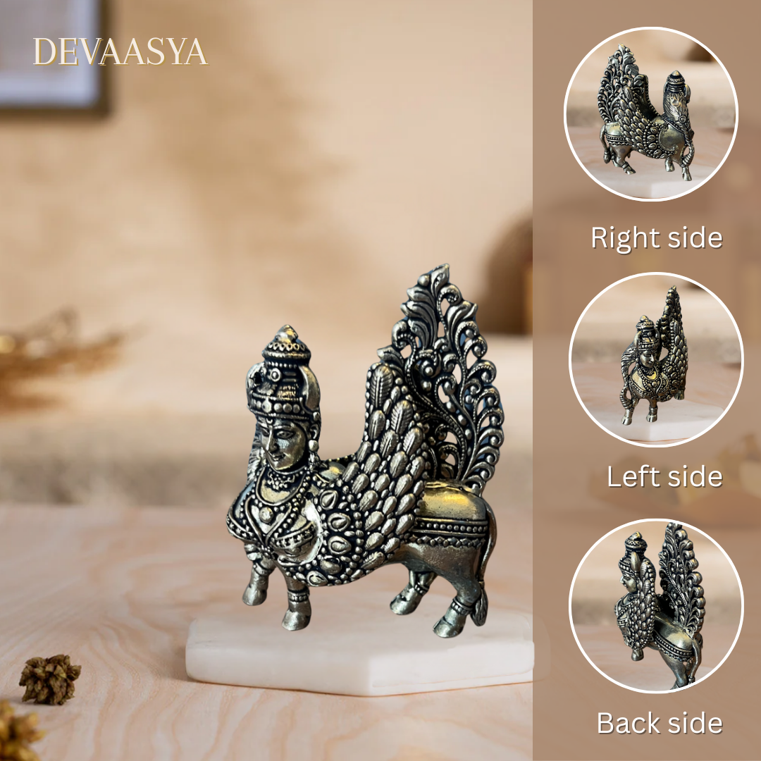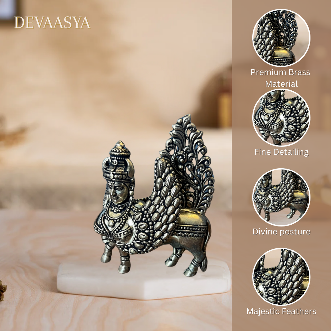 Bring home the divine presence of Lord Kartikeya seated gracefully on the sacred Kamdhenu cow, a symbol of strength, wisdom, and abundance. This handcrafted brass idol is meticulously detailed by skilled artisans, making it a perfect addition to your pooja room, spiritual décor, or as a vastu remedy. Ideal for gifting on festivals, housewarmings, and special occasions, it radiates blessings of courage, prosperity, and protection.