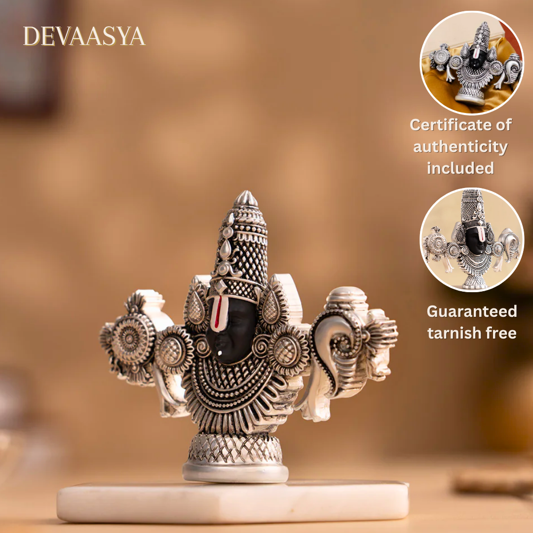Embrace the divine aura of Lord Venkateswara (Balaji) with this exquisitely crafted Silver Matte Antique Finish Idol from Devaasya. Designed in a compact size, this idol is perfect for home mandirs, car dashboards, study tables, and gifting purposes.